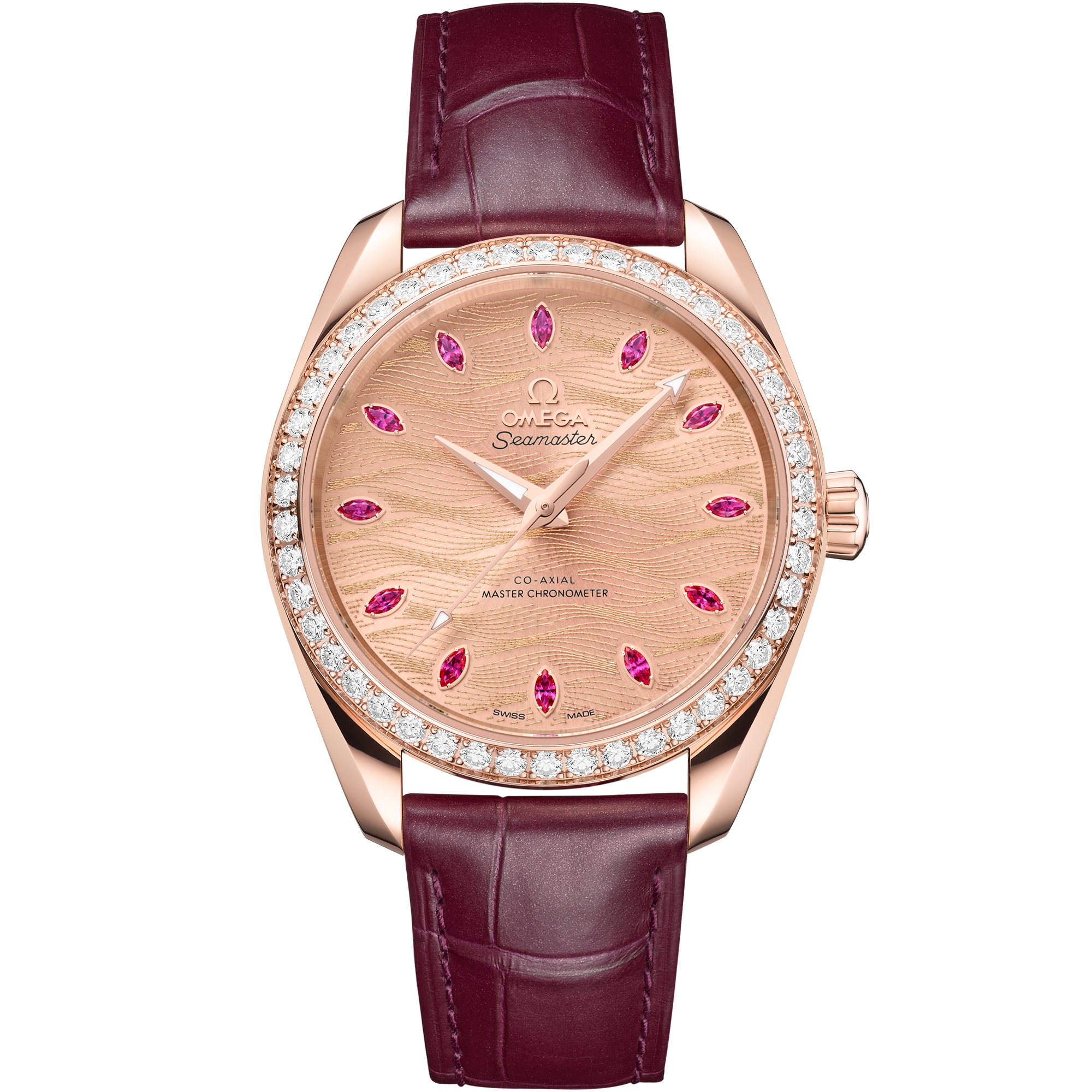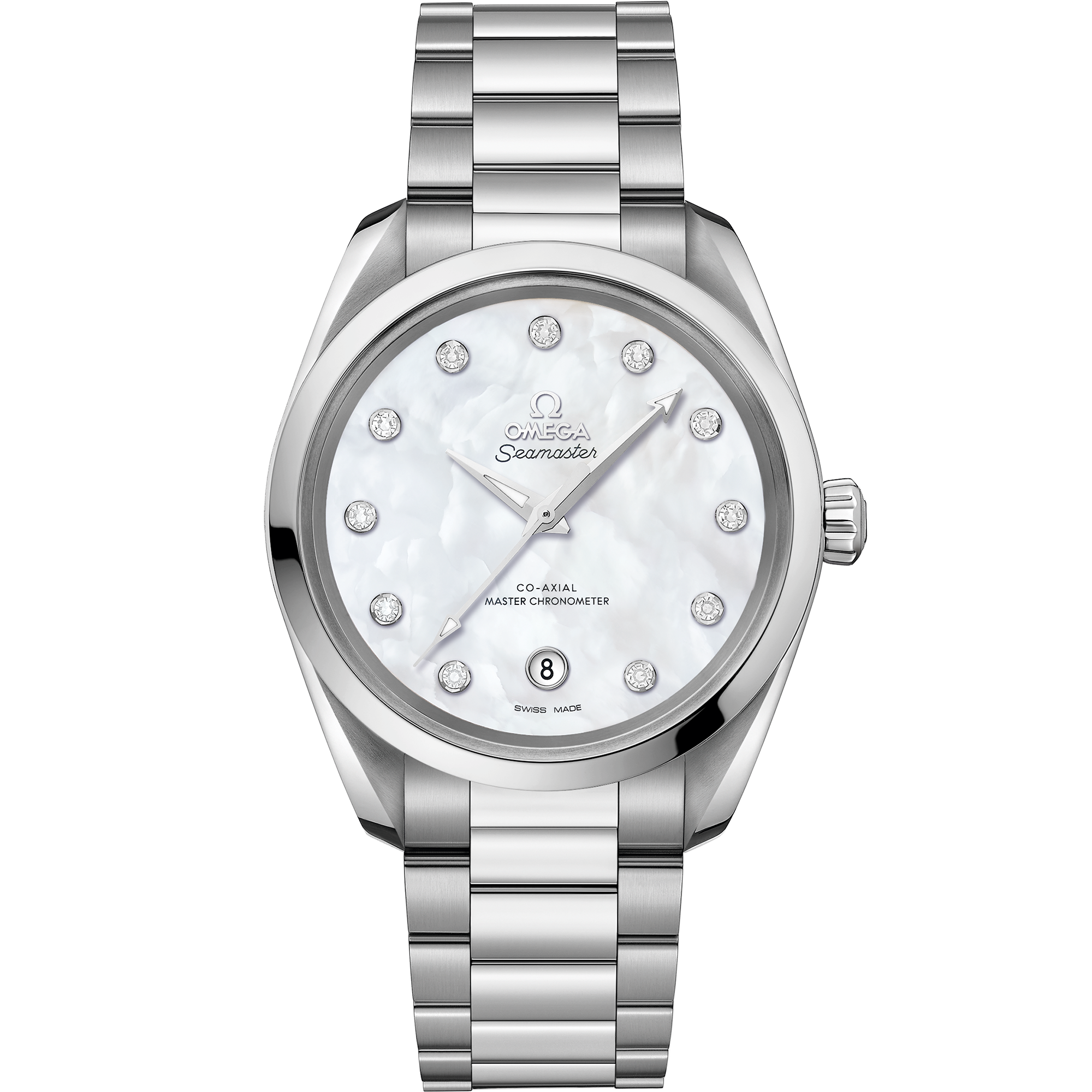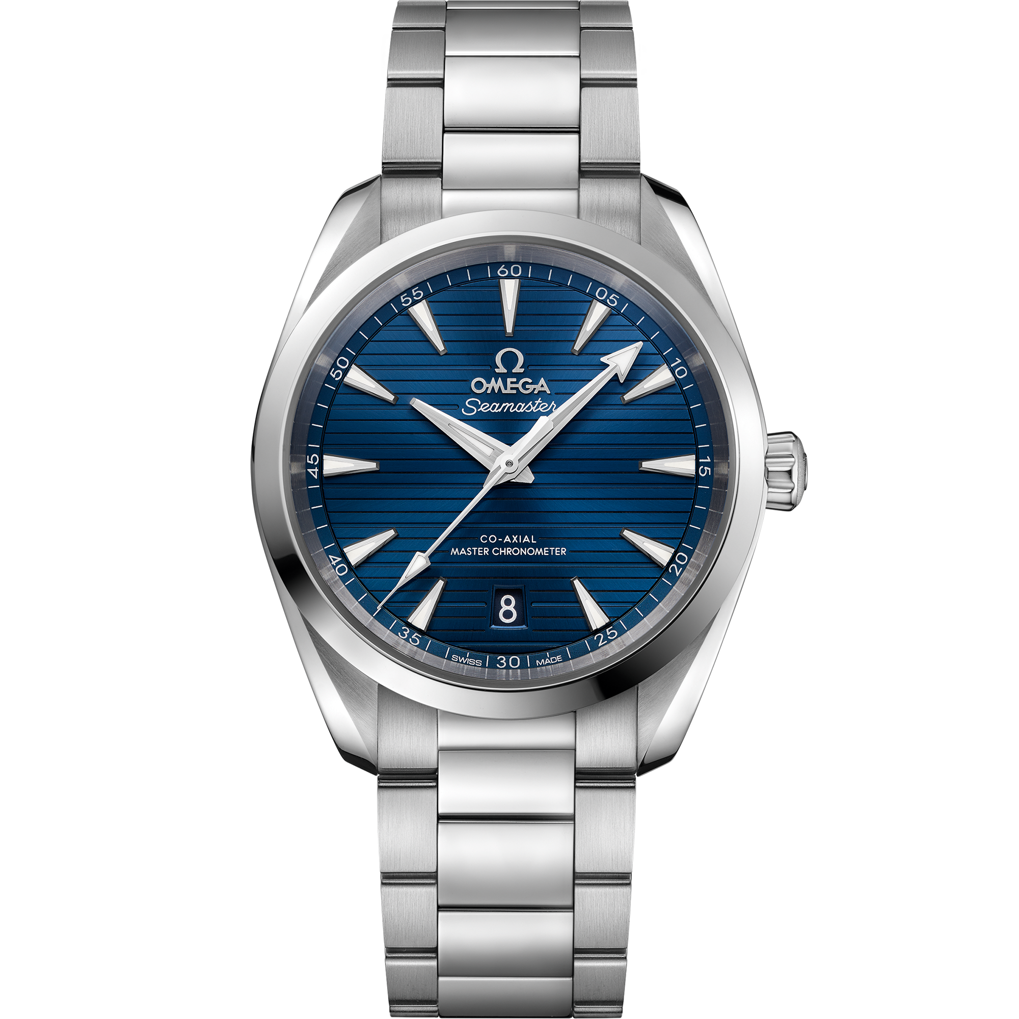 This 38 mm Aqua Terrawith a symmetrical case in fully polished stainless steelhas a polished and brushed bracelet formed by beautifully rounded links. The sun-brushed dialin OMEGA’s own Summer Blueis PVD-treated and varnished with a gradient finish to reflect the watch’s level of water resistance. It has rhodium-plated hands and sailboat hull indexes filled with a unique light blue Super-LumiNova and a matching blue date window indicator at 6 o’clock. Turning the watch over reveals a stamped commemorative Seamaster logo depicting a trident-bearing Poseidon and two seahorses: OMEGA’s 1956 original and the brand’s current design. Behind which sits OMEGA’s Co-Axial Master Chronometer calibre 8800certified at the industry’s highest level by the Swiss Federal Institute of Metrology (METAS).